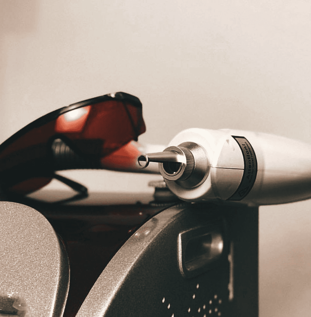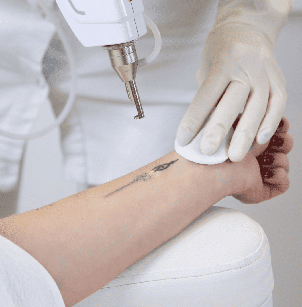 Процедура начинается с применения неодимового лазера, который фрагментирует пигмент татуировки.