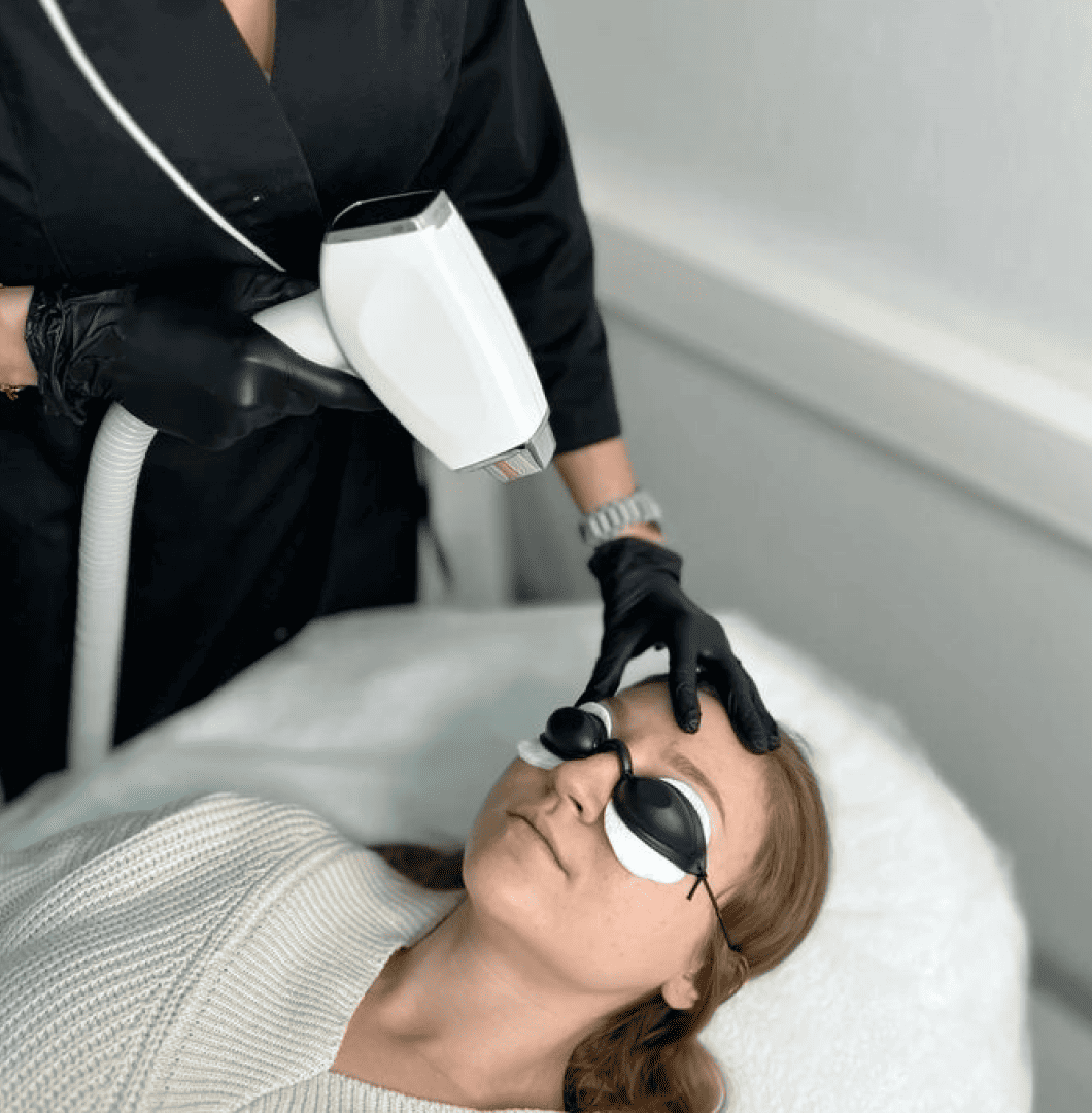 Пациент и специалист надевают специальные защитные очки для предотвращения повреждения зрения.